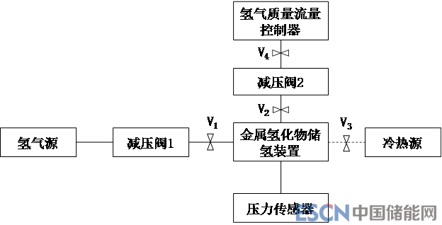 6.1.1 按照圖2所示的連接示意圖將金屬氫化物儲氫裝置與高壓氫氣源、減壓閥、氫氣質量流量控制器、壓力傳感器、冷熱源等儀器設備連接起來。
