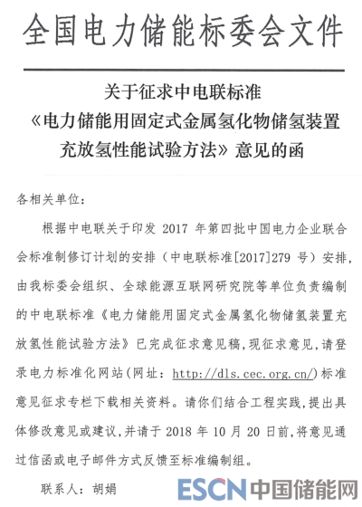 近日,中電聯(lián)發(fā)布關于征求中電聯(lián)標準《電力儲能用固定式金屬氫化物儲氫裝置充放氫性能試驗方法》意見的函,
