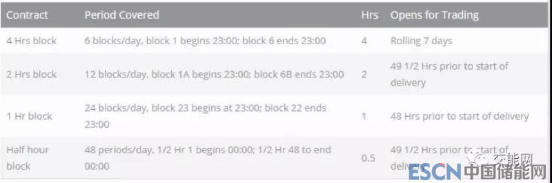 小時(shí)交易合約覆蓋日前合約以外的4小時(shí),交易時(shí)間為10:15 PM,在相應(yīng)的流動(dòng)期前三天。日前合同可以作為基本負(fù)荷(每小時(shí)1MW的恒流電力,11:00 PM到第二天晚上11:00 PM,每日) 和峰值負(fù)荷(恒流每小時(shí)1MW的電力,7:00 AM到7:00 PM,周一至周五)。這些合約在上市前兩天的10:15 PM上市交易。所有合同的報(bào)價(jià)單位是£/kWh,最小單位為£0.01?,F(xiàn)貨合約是連續(xù)交易的。