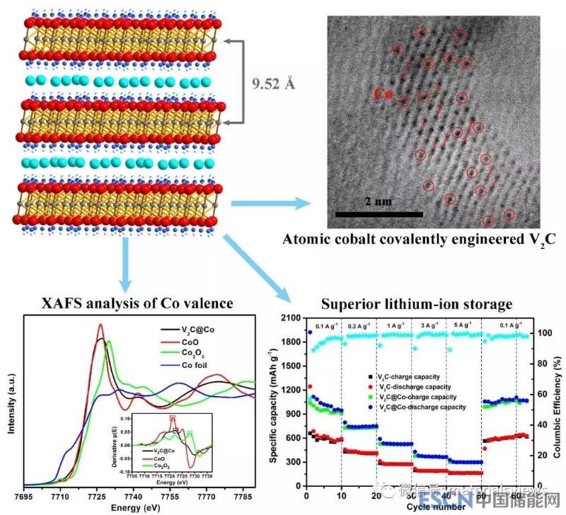 近期,中國科學(xué)技術(shù)大學(xué)國家同步輻射實(shí)驗(yàn)室宋禮教授課題組通過鈷離子插層策略,成功設(shè)計(jì)和制備了具有超高儲鋰容量和優(yōu)異循環(huán)穩(wěn)定性的碳化礬 MXene電極材料。該研究通過液相刻蝕手段,在35℃下用HF刻蝕V2AlC MAX相得到了面間距為0.735 nm(小于以往報道面間距)的V2C MXene,在0.1 A/g的電流密度下表現(xiàn)出686.7 mA h/g 的儲鋰比容量,更加接近于V2C MXene約940 mA h g-1的理論儲鋰容量。在此基礎(chǔ)上,進(jìn)一步通過鉀離子預(yù)插層和鈷離子交換方法,獲得了面間距擴(kuò)大為0.952 nm的V2C MXene。同步輻射X-ray吸收譜分析證實(shí)了這種Co插層MXene層與層之間具有穩(wěn)定的V-O-Co鍵,其中二價鈷離子主要存在于V2C內(nèi)部層間,三價鈷離子主要存在于近表面的層間, 并最終計(jì)算了V2C中鈷離子的平均化合價為+2.12。由于插層鈷離子贗電容的貢獻(xiàn)以及V-O-Co鍵的形成,該插層材料表現(xiàn)出1117.3 mA h/g的儲鋰放電比容量,并且經(jīng)15000圈的循環(huán)充放電之后幾乎沒有容量衰減。進(jìn)一步將V2C@Co電極作為正極與石墨烯負(fù)極組裝成鋰離子電容器并同樣展現(xiàn)出優(yōu)異的性能。這一研究工作基于同步輻射軟線和硬線的X-ray吸收譜技術(shù),不僅有效地解析了插層離子在MXene層間的存在形式,同時也為理解二維電極材料的能量存儲和轉(zhuǎn)化機(jī)制提供了一種有力的檢測手段。