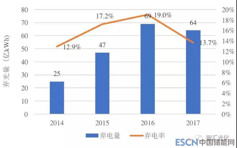 2017年,在國家電網(wǎng)的努力下,西北五省光伏電站的棄光率、棄光率都有明顯的降低。然而,即使如此,根據(jù)西北電監(jiān)局的統(tǒng)計,西北五省2017年的棄光率仍然達到14.1%,近66.7億kWh的光伏電力被棄掉(如下表所示)。最高的新疆、甘肅的棄光率高達21.6%和20.8%!