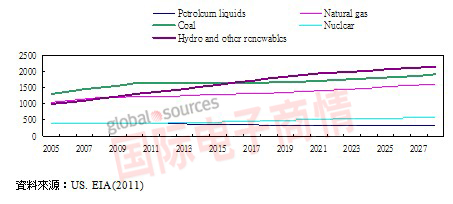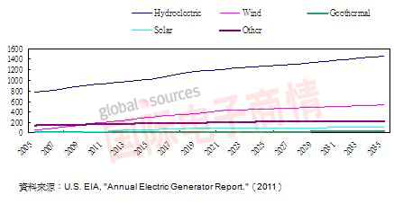 依據(jù)美國能源信息部(Energy Information Administration,EIA)再生能源包含水力發(fā)電及其它風(fēng)力、太陽能發(fā)電將維持年復(fù)合成長率2.7%至2035年,成長率高于其它發(fā)電電源,如圖二。