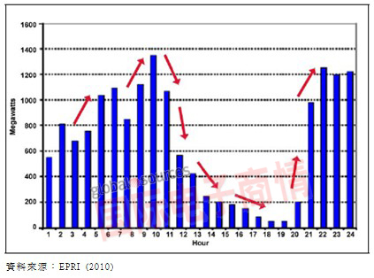 由圖四所示、未來全球再生能源風(fēng)力發(fā)電、PV發(fā)電的建置容量將持續(xù)提升。水力發(fā)電安裝量最大,PV發(fā)電安裝量的成長率最高,年復(fù)合成長率達8.3%,緊接的是風(fēng)力發(fā)電的5.3%,地?zé)岬?.7%及水力發(fā)電的2%。DOE在2008年報告預(yù)估2030年美國風(fēng)力發(fā)電將達到300GW,估計需要預(yù)備50GW的發(fā)電容量以配合風(fēng)力發(fā)電不穩(wěn)的變化量,預(yù)期儲能系統(tǒng)可在此扮演重要的角色。