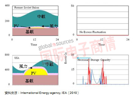 以各國電力分布來看電網(wǎng)儲能需求,前蘇聯(lián)(FormerSovietunion ,FSU)因至2050年的再生能源包含風(fēng)力及太陽能在能源的占比很低,見圖五,所以無電網(wǎng)儲能的需求。其它再生能源發(fā)展國家,以美國為例,其電力組合基載、風(fēng)力及PV發(fā)電的供給總和在某些時段可能會超過需求,在此情況下,電網(wǎng)儲能可有效的儲存電網(wǎng)剩余電力。