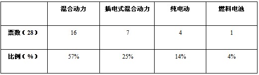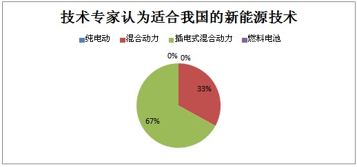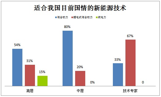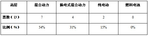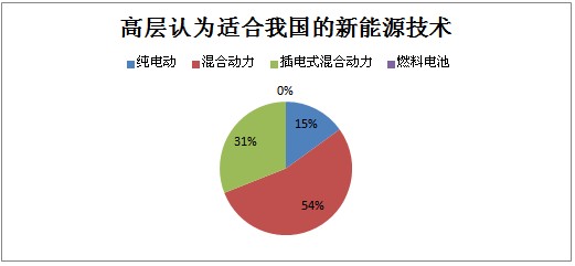 圖表2、3、4、5數(shù)據(jù)顯示,高層和中層認為混合動力是目前的主推方向,而技術(shù)專家則認為在混合動力將作為過渡階段,在國家政策的支持下,看好插電式混合動力的發(fā)展。