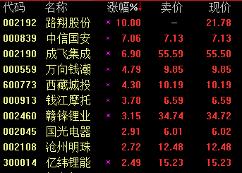 中國儲能網(wǎng)訊:鋰電池概念早盤飆升,截至發(fā)稿,路翔股份漲停,中信國安漲逾7%,成飛集成漲逾6%,萬向錢潮、西藏城投漲逾4%,錢江摩托、贛鋒鋰業(yè)漲逾3%,板塊個股漲多跌少。