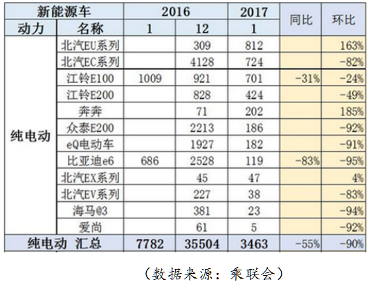 中國儲能網(wǎng)訊:日前,乘聯(lián)會發(fā)布1月純電動汽車銷量數(shù)據(jù)。受限于政策調(diào)整,1月純電動乘用車銷量3463輛,同比下降超50%。(新能源汽車為何2017首月低迷開局)。