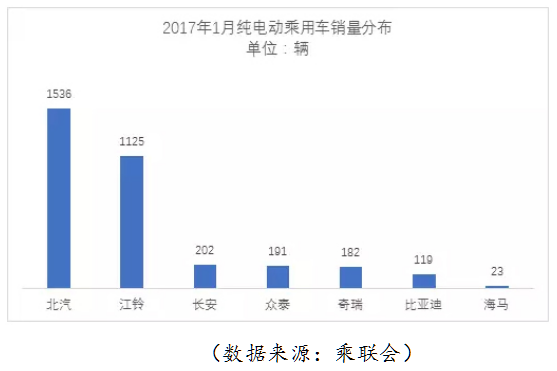 在這3463輛已銷售的純電動乘用車中,1536輛來自北汽新能源,1125輛來自江鈴,長安、眾泰、奇瑞、比亞迪等品牌的純電動乘用車銷售數(shù)量僅在100至200輛之間徘徊。