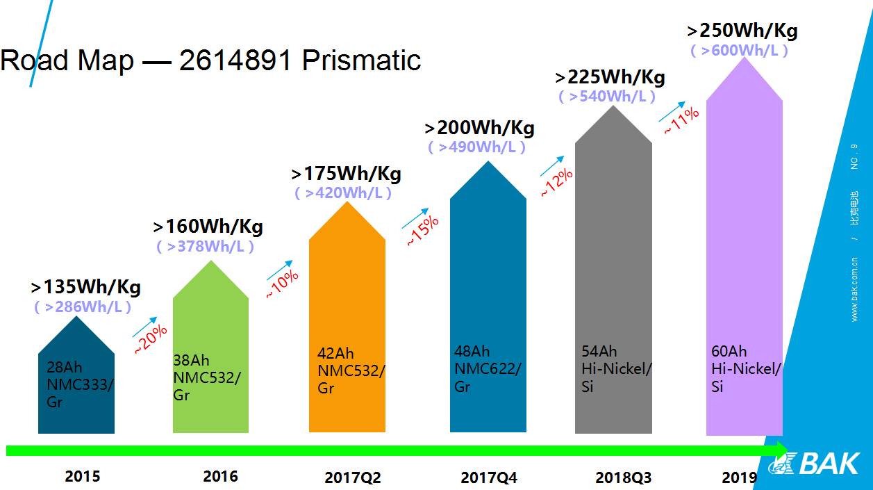 據(jù)介紹,比克電池通過增加電池中的鎳含量不斷提高電池能量密度,目前比克18650電池量產(chǎn)后能量達(dá)到3.5Ah,下一步將開發(fā)21700電池,通過結(jié)合高鎳與硅碳,實(shí)現(xiàn)21700電池量產(chǎn)能量達(dá)6.0Ah。目前正極材料NMC正極克容量?jī)H為160mAh/g,而隨著鎳含量的增加,NCA能量密度能夠達(dá)到180mAh/g,甚至200mAh/g以上;在負(fù)極材料中石墨已經(jīng)達(dá)到容量的極限,而硅碳發(fā)展前景十分光明,目前容量可做到1400mah/g以上。