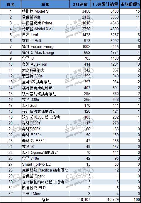 正如預(yù)期所示,三月份特斯拉Model S的銷量再次擊敗雪佛蘭Volt并蟬聯(lián)月度銷量冠軍,總計(jì)售出3450輛,但與去年同期相比減少500輛;此外,特斯拉Model S在累計(jì)銷量方便也超過了Volt,前三個(gè)月累計(jì)售出6100輛,而雪佛蘭Volt則售出5563輛。此外,特斯拉Model X也憑借2750的銷量創(chuàng)下了歷史最好成績;前三個(gè)月共計(jì)售出4300輛,累計(jì)銷量排在第四位。