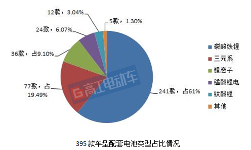 中國儲(chǔ)能網(wǎng)訊: 在395款車型中,有241款車型搭載了磷酸鐵鋰電池,占比最高,達(dá)到了61%。其次是三元材料電池,數(shù)量是77款,占比達(dá)19.49%。而錳酸鋰電池和鈦酸鋰電池則分別占了24款和12款,還有36款標(biāo)注為鋰離子電池。