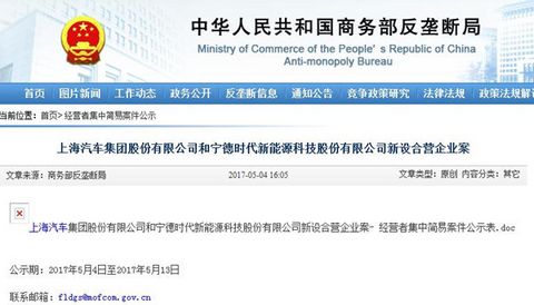 中國(guó)儲(chǔ)能網(wǎng)訊:5月4日,商務(wù)部反壟斷局官方網(wǎng)站上發(fā)布了一個(gè)關(guān)于《上海汽車集團(tuán)股份有限公司和寧德時(shí)代新能源科技股份有限公司新設(shè)合營(yíng)企業(yè)案》公示。