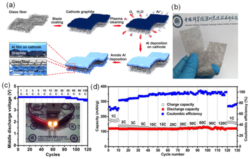 中國儲能網(wǎng)訊:近日,中國科學(xué)院深圳先進(jìn)技術(shù)研究院集成所功能薄膜材料研究中心研究員唐永炳及其研究團(tuán)隊成功研發(fā)出一種一體化結(jié)構(gòu)設(shè)計的柔性超快充放電池,這種新型結(jié)構(gòu)設(shè)計顯著提升了電池的快充快放特性,同時保持了高的能量密度和循環(huán)性能。相關(guān)研究成果Integrated Configuration Design for Ultrafast Rechargeable Dual-Ion Battery(《一體化結(jié)構(gòu)設(shè)計的超快充放雙離子電池》)已在線發(fā)表于國際期刊《先進(jìn)能源材料》(Advanced Energy Materials,DOI: 10.1002/aenm.201700913)上,并申請1項國際發(fā)明專利(PCT/CN2017/078205)。
