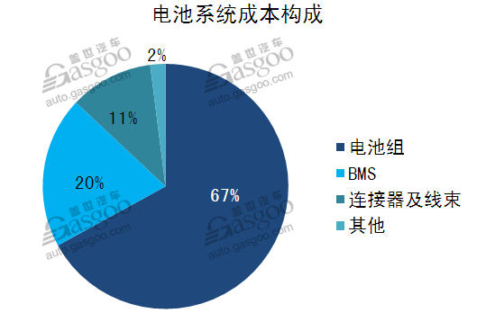 市場熱度如此之高,成本控制顯得十分重要。電池系統(tǒng)的成本構(gòu)成中,電池組占據(jù)了大部,約67%,而BMS系統(tǒng)則占據(jù)了第二大份額,約20%。