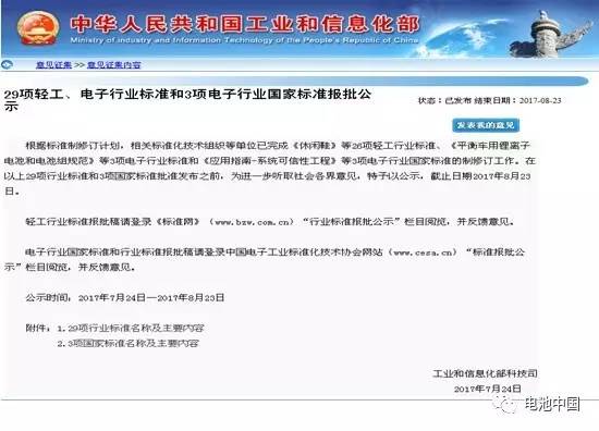 中國儲能網(wǎng)訊:近日,國家工信部發(fā)布了多項行業(yè)標(biāo)準(zhǔn)和國家標(biāo)準(zhǔn)意見征集,其中涉及電池領(lǐng)域的有SJ/T 11685-2017《平衡車用鋰離子電池和電池組規(guī)范》、HGCPZT1613-2017《動力電池外殼用絕緣阻燃膠粘帶》及JCCPZT1683-2017《動力型鋰離子電池陶瓷密封圈》。