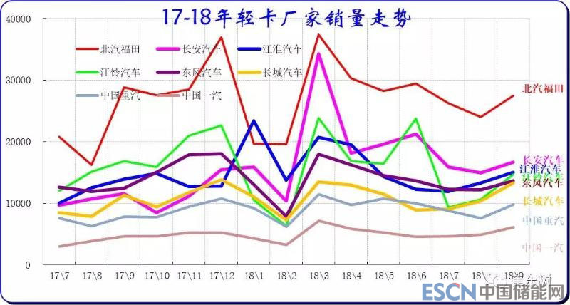 18年9月的輕卡主力廠家分化較明顯,福田和長安走勢超強,江鈴、江淮、重汽和力帆、及唐駿的輕卡表現(xiàn)較強。主力車企的福田保持超強的龍頭地位。江鈴的銷量表現(xiàn)環(huán)比超強。長安的輕卡走勢很強,從微卡強勢企業(yè)升級成為輕卡第二強勢企業(yè)。