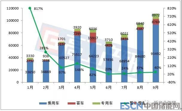 2018年1-9月我國新能源汽車產量分析(輛,%)