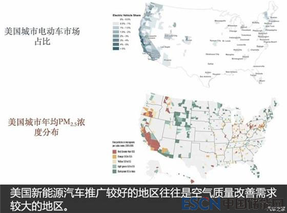 另外一個重要區(qū)別是,美國城市已經(jīng)把新能源汽車推廣作為當(dāng)?shù)乜諝赓|(zhì)量改善的重要推手,并且美國新能源汽車推廣較好的地區(qū)往往是空氣質(zhì)量改善需求較大的地區(qū)。