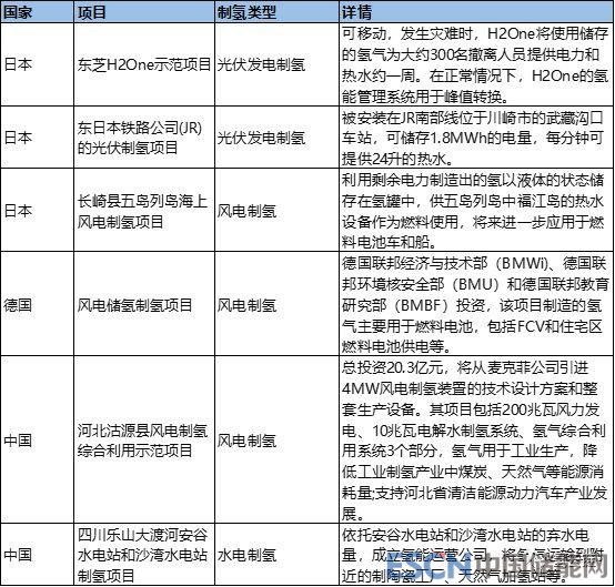 (3)國外產(chǎn)業(yè)示范案例。日本、德國已積極布局風(fēng)電、光伏發(fā)電制氫項(xiàng)目;國內(nèi)也開始利用豐富的水電、風(fēng)電資源開展制氫項(xiàng)目,見表1。