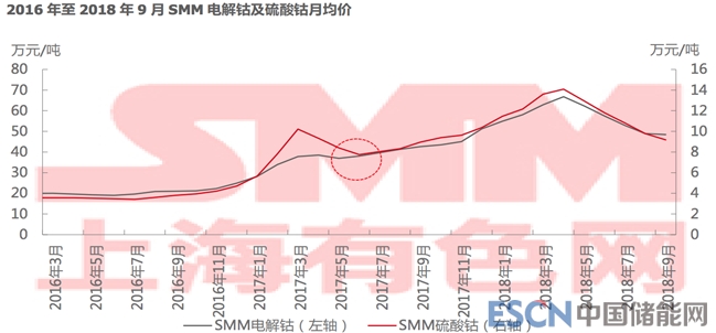 補(bǔ)貼政策對(duì)鈷價(jià)的影響雖無(wú)直接事件反映,但卻可以通過(guò)同比價(jià)格走勢(shì)中觀(guān)察到。同比2017年第2,3季度,2季度末3季度初,2018鈷價(jià)并未復(fù)刻去年行情出現(xiàn)價(jià)格拐點(diǎn)。該時(shí)段內(nèi)基本面同為供過(guò)于求,但今年行情無(wú)法重復(fù)的重要原因即是終端受制于補(bǔ)貼退坡后資金緊張,材料廠(chǎng)現(xiàn)金流承壓,跟漲外媒無(wú)力。