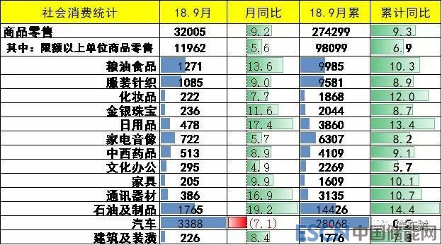 2018年9月份,社會消費品零售總額32005億元,同比名義增長9.2%。其中,限額以上單位消費品零售額12762億元,增長5.7%。2018年1-9月份,社會消費品零售總額274299億元,同比增長9.3%。其中,限額以上單位消費品零售額104792億元,增長6.9%。。