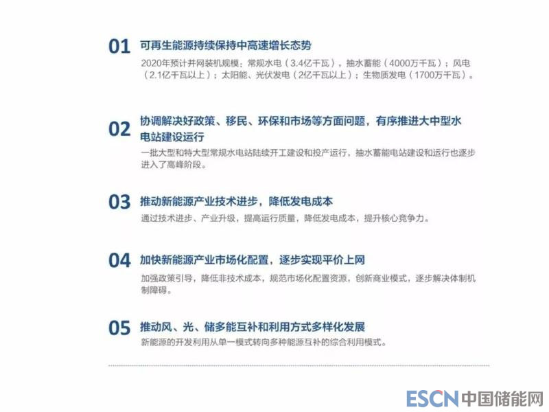 2018-2020中國可再生能源發(fā)展的前景:一是可再生能源持續(xù)保持中高速增長的態(tài)勢,常規(guī)水電和抽水蓄能、風(fēng)電、生物質(zhì)發(fā)展目標與“十三五”目標基本一致,太陽能發(fā)電較快,超過“十三五”目標;二是通過協(xié)調(diào)解決好政策、移民、環(huán)保和市場等方面的問題,有序推進大中型水電站的建設(shè);三是通過推動新能源產(chǎn)業(yè)的技術(shù)進步,降低發(fā)電成本;四是加快新能源產(chǎn)業(yè)市場化的配置,逐步實現(xiàn)平價上網(wǎng);五是推動風(fēng)、光、儲多能互補和利用方式的多元化發(fā)展。