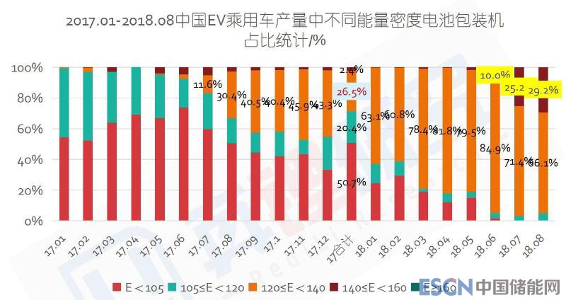 2017-2018.8 中國(guó)電動(dòng)汽車(chē)乘用車(chē)產(chǎn)量中不同能量密度電池包的裝機(jī)占比 來(lái)源:真鋰研究
