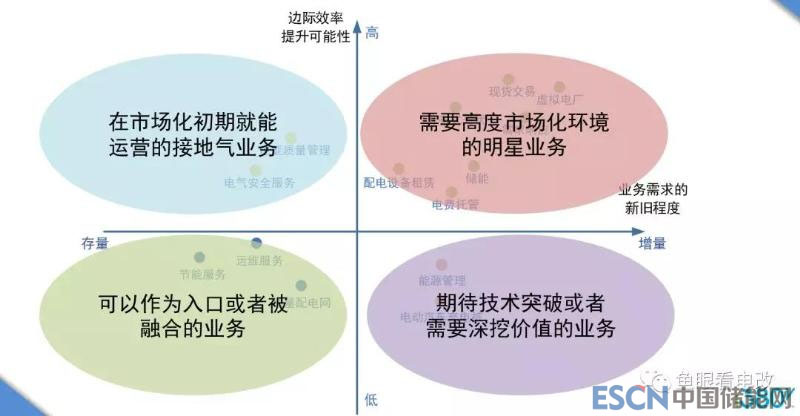 就商業(yè)模式來(lái)說(shuō),我們肯定覺(jué)得“新的需求+高邊際效率”的業(yè)務(wù)(右上角象限)是最有前途的,互聯(lián)網(wǎng)企業(yè)的打法也都是聚焦在這個(gè)象限。但是就電力行業(yè)來(lái)說(shuō),這個(gè)象限并不是所有的業(yè)務(wù)都馬上能落地的,原因是:電力或者能源行業(yè)并未如零售消費(fèi)端那樣徹底市場(chǎng)化,其結(jié)果就是業(yè)務(wù)受政策影響很大,不確定性很高。比如儲(chǔ)能業(yè)務(wù),可能工商業(yè)電價(jià)一下降,或者工商業(yè)可轉(zhuǎn)為兩部制電價(jià)的政策一落地,工商業(yè)儲(chǔ)能業(yè)務(wù)的短期風(fēng)險(xiǎn)就會(huì)快速增加。
