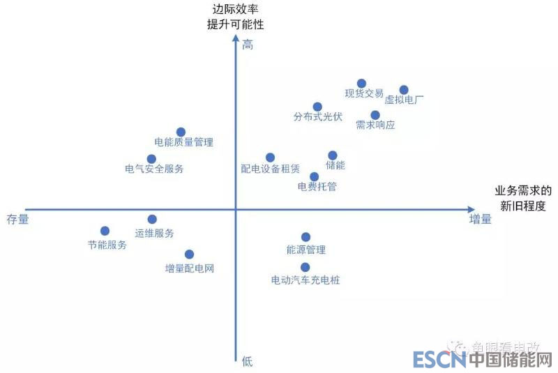 下面我們按照上述的兩個維度,對現(xiàn)有的一些綜合能源服務業(yè)務進行了定位,這只是一個示意圖,并不代表未來的趨勢和方向,僅供大家參考。