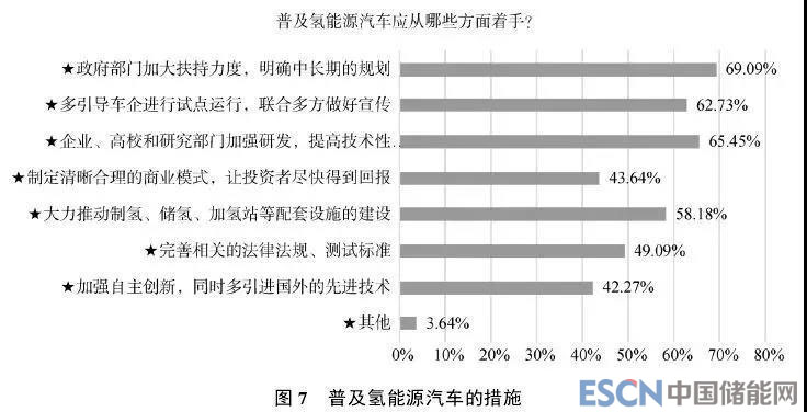 汽車產(chǎn)業(yè)牽涉到科技、文化、經(jīng)濟(jì)等多個(gè)社會(huì)領(lǐng)域,代表著國(guó)家的發(fā)展意志,因此政府的政策支持與引導(dǎo)就顯得尤為重要。《調(diào)查》中顯示,對(duì)于普及氫能源汽車應(yīng)從哪些方面著手?(如圖7)超過半數(shù)的民眾都支持以下幾個(gè)方面:①政府部門加大扶持力度,明確中長(zhǎng)期的規(guī)劃;@企業(yè)、高校和研究部門加強(qiáng)研發(fā),提高技術(shù)性能,同時(shí)降低生產(chǎn)成本;③多引導(dǎo)車企進(jìn)行試點(diǎn)運(yùn)行,聯(lián)合多方做好宣傳;④大力推動(dòng)制氫、儲(chǔ)氫、加氫站等配套設(shè)施的建設(shè)。由此可見,普及氫能源汽車,人們認(rèn)為對(duì)政策、科技和基礎(chǔ)設(shè)施的投入最為重要。