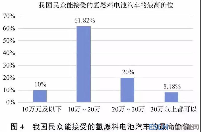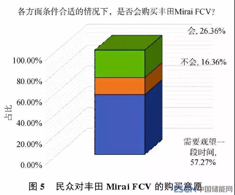 產(chǎn)業(yè)模式上,應(yīng)該做好中長(zhǎng)期的產(chǎn)業(yè)布局,目前可以讓燃料電池商用車做好示范運(yùn)行,再逐漸把燃料電池技術(shù)推廣和應(yīng)用至乘用車上。成本的降低不僅依靠技術(shù)的進(jìn)步,還有賴于規(guī)模化生產(chǎn)。目前,中國(guó)生產(chǎn)的燃料電池組成本需10000美元/kW,日本生產(chǎn)的燃料電池組成本也需2000美元/kW,美國(guó)能源局經(jīng)過測(cè)算認(rèn)為只有當(dāng)燃料電池的成本降至50美元/kW時(shí),才能與內(nèi)燃機(jī)汽車形成競(jìng)爭(zhēng)。通過《調(diào)查》還發(fā)現(xiàn),以中國(guó)目前的消費(fèi)水平,有61.82%的人能接受的氫燃料電池汽車的價(jià)格都在10?20萬這個(gè)區(qū)間(如圖4),參照豐田Mirai現(xiàn)在30萬元左右的售價(jià),顯然FCV的價(jià)格還不能引起人們的購(gòu)買欲望(從圖5有57.27%的人持觀望態(tài)度也可以看出),反映出來的問題便是氫燃料電池的成本還有極大的下降空間。