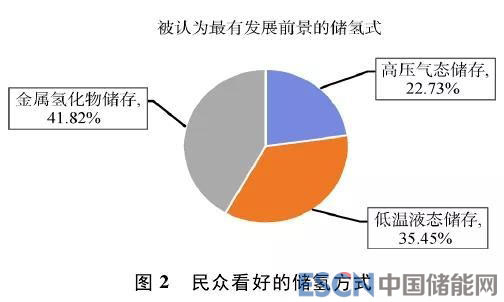固態(tài)吸氫材料儲(chǔ)氫是利用某些金屬絡(luò)合物來吸附氫氣的。研究發(fā)現(xiàn),把鎂、鈦、鋯、鈮、鑭等金屬及它們的合金制成絡(luò)合物,再將它們置于高壓(<5MPa)的氫氣環(huán)境中,這些金屬就會(huì)像海綿吸水一樣把氫氣儲(chǔ)存起來,只需通過加熱或減壓的方式就能讓它們把氫氣釋放出來。金屬氫化物單位體積的儲(chǔ)氫密度是相同溫度、壓力條件下氣態(tài)氫的1000倍,儲(chǔ)氫能力優(yōu)于氣態(tài)儲(chǔ)氫和液態(tài)儲(chǔ)氫。在《調(diào)查》中(見圖2),約有42%的人認(rèn)為"金屬氫化物儲(chǔ)存"是最有發(fā)展前景的車載儲(chǔ)氫方式(占比最大),可見該儲(chǔ)氫方式的確是最符合汽車的使用要求的。