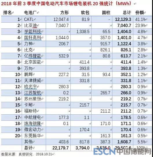 下表是2018年前3季度中國(guó)電動(dòng)汽車市場(chǎng)鋰電裝機(jī)20強(qiáng)統(tǒng)計(jì)情況。前3季度共有86家電池芯廠商實(shí)現(xiàn)了裝機(jī),其中前20強(qiáng)占據(jù)了94.5%的市場(chǎng)份額。CATL以12.1GWh的裝機(jī)總量遙遙領(lǐng)先于其他電池廠商,獨(dú)占41.1%的市場(chǎng)份額;比亞迪以7.0GWh位居第二,雖然與CATL的差距較大,但同樣較大幅度領(lǐng)先于身后的諸多廠商;孚能科技、國(guó)軒高科和天津力神屬于一個(gè)梯隊(duì),各自的總裝機(jī)量都超過了1GWh。這5強(qiáng)合計(jì)市場(chǎng)份額高達(dá)78.3%。