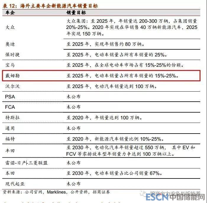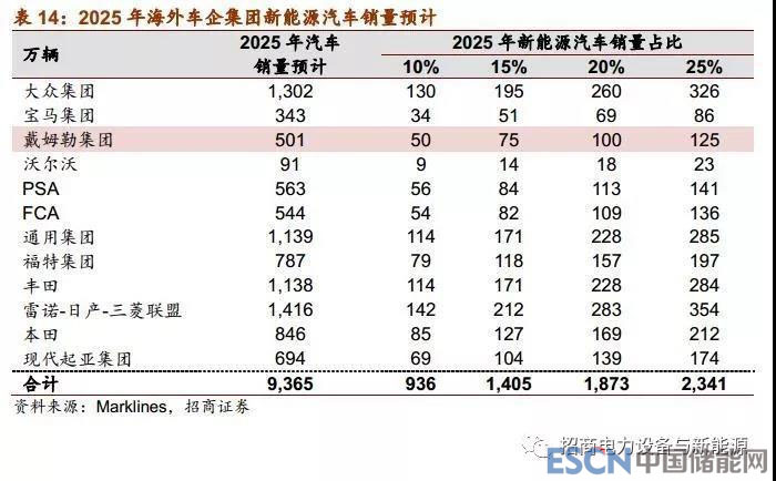 2025年海外車企新能源車當(dāng)年銷量預(yù)計(jì)達(dá)1400萬(wàn)輛以上:2012-2017年,海外12大車企集團(tuán)(不包含特斯拉)所有整車銷量CAGR約2.6%。假設(shè)該復(fù)合增速為2017-2025年的增速,對(duì)應(yīng)2025年銷量為9365萬(wàn)輛。我們分別假設(shè)2025年12大車企集團(tuán)新能源汽車(EV+PHEV)滲透率為10%、15%、20%、25%,分別對(duì)應(yīng)936、1405、1873、2341萬(wàn)輛的當(dāng)年銷量。中性預(yù)測(cè)2025年海外12大車企的新能源汽車銷量有望達(dá)到1400-1900萬(wàn)輛。