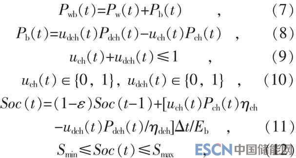 式中: Pw(t)為 t時(shí)刻風(fēng)電出力; Pch(t)為 t時(shí)刻儲(chǔ)能電池的充電功率;Pdch(t)為t時(shí)刻儲(chǔ)能電池的放電功率; uch(t)和 udch(t)分別表示儲(chǔ)能電池 t時(shí)刻的充、 放電狀態(tài), uch(t)=1 和 udch(t)=1 分別表示儲(chǔ)能電站t時(shí)刻處于充電和放電狀態(tài);Soc(t)為t時(shí)刻的電池荷電狀態(tài);ε為電池自放電率;ηch和ηdch分別為儲(chǔ)能電池的充、放電效率;Smax和Smin分別為儲(chǔ)能電池荷電狀態(tài)的允許上、下限值。