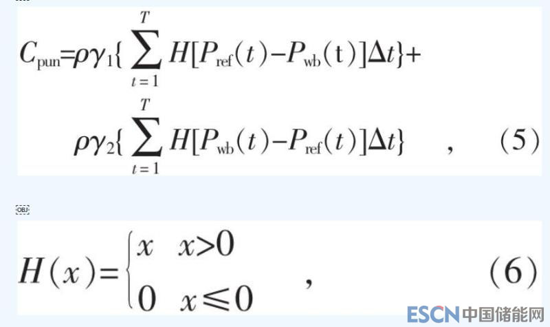 式中:γ1和γ2分別為缺電懲罰系數(shù)、棄風(fēng)懲罰系數(shù),反映了電力系統(tǒng)對(duì)風(fēng)儲(chǔ)聯(lián)合發(fā)電系統(tǒng)執(zhí)行計(jì)劃出力要求的嚴(yán)格程度,懲罰系數(shù)越高,對(duì)聯(lián)合發(fā)電系統(tǒng)的可控性要求就越高;Pref(t)為聯(lián)合系統(tǒng)在時(shí)段t的計(jì)劃出力。式(5)的第1項(xiàng)為研究周期內(nèi)的缺電懲罰成本,第2項(xiàng)為棄風(fēng)懲罰成本。H(x)為引入的輔助函數(shù),式(6)保證風(fēng)儲(chǔ)聯(lián)合系統(tǒng)在t時(shí)刻只會(huì)有缺電懲罰成本和棄風(fēng)懲罰成本中的一種。