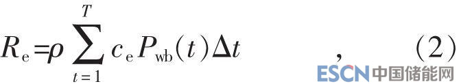式中:ce為考慮國(guó)家補(bǔ)貼的風(fēng)儲(chǔ)聯(lián)合系統(tǒng)上網(wǎng)電價(jià);Pwb(t)為風(fēng)儲(chǔ)聯(lián)合系統(tǒng)在時(shí)段t的輸出功率;ρ為一年中風(fēng)儲(chǔ)聯(lián)合系統(tǒng)運(yùn)行的天數(shù);Δt為1個(gè)采樣時(shí)段。