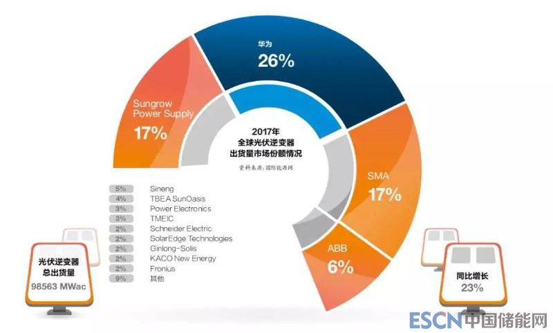 這個榜單發(fā)布的2017全球光伏逆變器出貨量也顯示,華為以26.4%的市場占有率連任全球第一大逆變器供應(yīng)商。