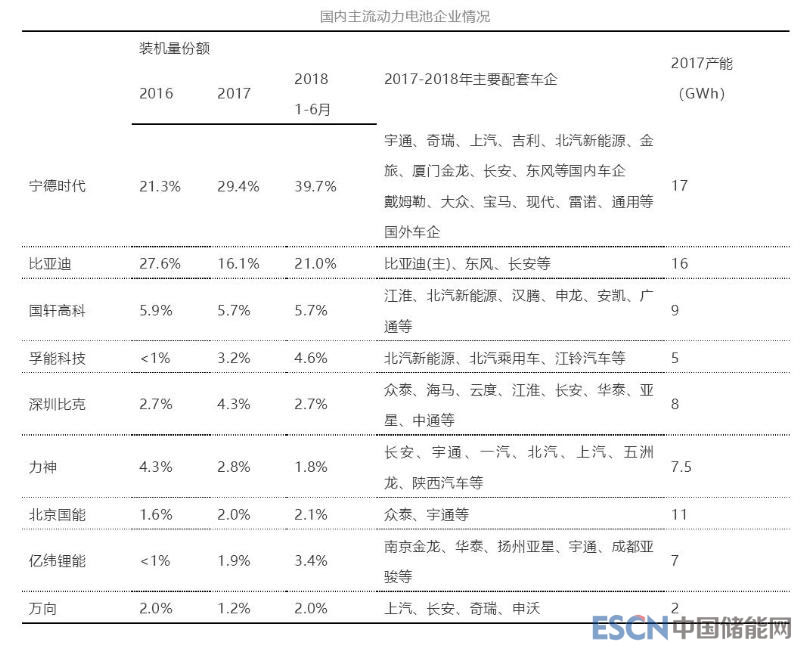 產(chǎn)能的高端與低端是相對的,一般根據(jù)動力電池產(chǎn)品品質(zhì)、生產(chǎn)技術(shù)水平、企業(yè)綜合實力、市場份額、應用領(lǐng)域來區(qū)分,通常也是主流車企的配套首選。高端產(chǎn)能的市場需求量正在提高,可從裝機量說明。2017年我國前10家動力電池企業(yè)裝機量總和達到26.7GWh,市場占有率為73.6%,2018年上半年增長到約85%。國內(nèi)主流動力電池企業(yè)以寧德時代、比亞迪為龍頭,是高端產(chǎn)能的集中陣營,貢獻了行業(yè)內(nèi)70%以上的裝機需求量。其中龍頭企業(yè)寧德時代、比亞迪的市場占有率由2017年的45.5%,提升到2018年上半年的60.7%。