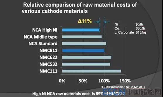 這位資深人士提倡直接發(fā)展NCA而非811的原因在于:1、雖然NCA的循環(huán)壽命比不上811,但其日歷壽命(指電池在某參考溫度下、開路狀態(tài)達(dá)到壽命終止所需的時(shí)間,即電池在備用狀態(tài)下的壽命)比811好得多;2、全球鈷資源有限,NCA只需用5%的鈷,811需要用10%,鈷用量越少成本越低,同時(shí)能夠造更多的車。
