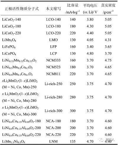 表1 計(jì)算所用正極活性物質(zhì)及其比容量、電壓