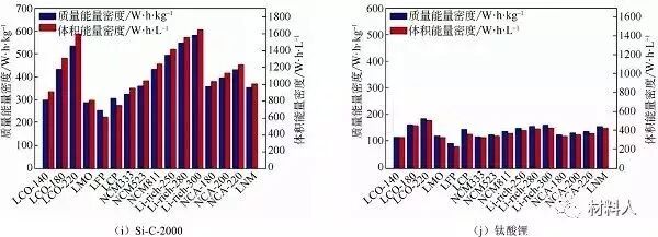 圖29(a)-(j)展示了10種不同負(fù)極與16中正極材料組合形成的電芯的能量密度的計(jì)算結(jié)果。圖2(i)標(biāo)明,Li-rich-300對Si-C-2000的電芯體系,所有的電池體系中具有最高質(zhì)量能量密度584Wh kg-2,以及最高的體積能量密度1645Wh L-1(不包括封裝材料和極耳)。