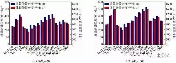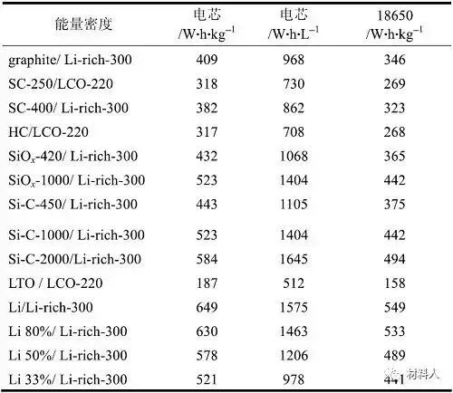 圖2 不同負(fù)極材料與不同正極材料匹配的電芯能量密度計(jì)算