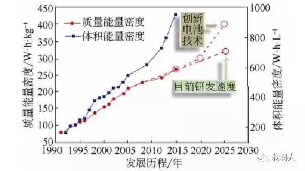 圖1 1990-2030年鋰離子電池能量密度發(fā)展路線圖