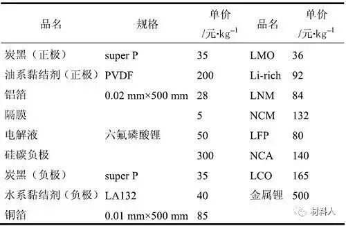 依據(jù)現(xiàn)有產(chǎn)業(yè)化的電芯組成和工藝條件,可以大致推算出不同電池電芯原材料成本價(jià)格,所用原材料的成本參見表9。
