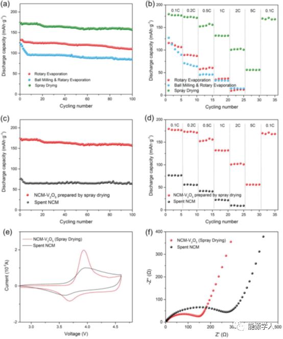 NCM–V2O5正極材料通過不同干燥方法后的a)循環(huán)性能和b)倍率性能。通過噴霧干燥獲得廢棄NCM和NCM–V2O5材料的c) 循環(huán)性能,d)倍率性能,e)循環(huán)伏安曲線以及f)交流阻抗圖.