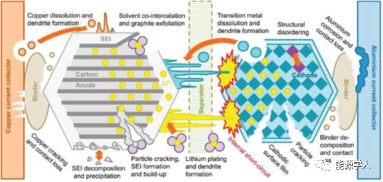 廢舊LIB成指數性增長的原因有很多,不管是由于壽命的正常終結,還是由于其它因素,例如電池膨脹、內部短路發(fā)熱、性能惡化、電解質泄漏等原因,都對回收者造成不可估量的負擔。充放電過程中在負極表面形成的固體電解質界面(SEI)層是鋰離子電池壽命延長的主要原因之一,主要包括Li2O、ROCO2Li、LiF、Li2CO3和ROLi等成分。而電解液分解過程中形成的氣體會增加電池內的壓力,觸發(fā)熱失控;在過充和過放時,負極上枝晶的聚集會導致電極之間的短路,并最終使LIB爆炸。此外,電解質和殘余水分之間的反應形成可溶解錳的HF,導致正極降解;由于充放電過程中產生的機械應變對負極的可逆容量有嚴重影響,石墨的結構將變得無序。