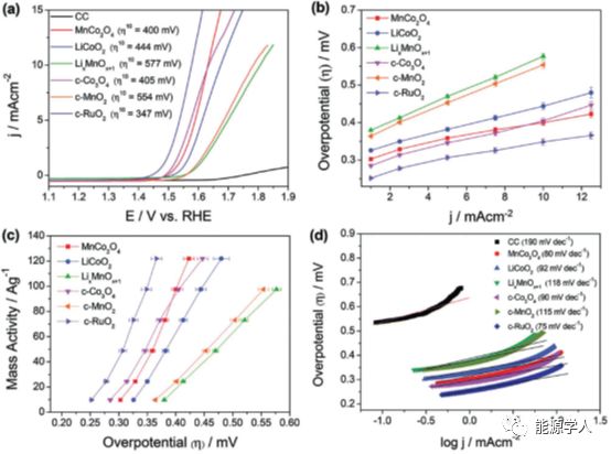 Figure11. a)純CC, 再生尖晶石MnCo2O4, 再生LiCoO2, 再生 LixMnOx+1,c-Co3O4, c-MnO2, c-RuO2在5 mV/s掃速下的LSV曲線. b) 各類催化劑的電流密度-過電位曲線. c) 各類催化劑的過電位-質量活性曲線. d) 各類催化劑的塔菲爾斜率曲線.