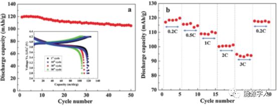 再生LiCoO2正極材料在25℃時的電化學性能: a) 0.2 C, b)倍率性能.