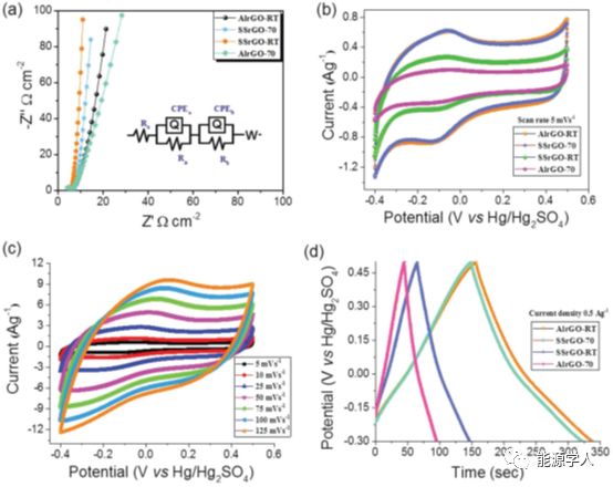 Figure10. a)四種電極(Al rGO-RT, SS rGO-70, SS rGO-RT, Al rGO-70)的交流阻抗結果. b) 四種電極(Al rGO-RT, SSrGO-70,SS rGO-RT, Al rGO-70)在5 mV/s掃速下的循環(huán)伏安曲線. c) Al rGO-RT 電極在不同掃速下(5–125 mV/s)的循環(huán)伏安曲線. d)四種電極(Al rGO-RT,SSrGO-70, SS rGO-RT, Al rGO-70)在0.5 A/g下的恒流充放電曲線.